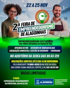 De 22 a 25 de novembro, a Prefeitura de Alagoinhas, por meio da Secretaria de Desenvolvimento Econômico e Meio Ambiente (SEDEA), realiza a II Feira de Empreendedorismo de Alagoinhas, com exposições e cursos gratuitos, em parceria com o SEBRAE, o SENAC e o CREDBAHIA. O tema deste ano é “Empreendedorismo sustentável: uma forma inovadora de mudar de vida”.