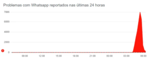 O site “Downdetector”, que reúne relatos de falhas em diversos aplicativos e plataformas, registrou um pico de queixas sobre o WhatsApp por volta das 5h, no horário de Brasília (veja na imagem abaixo). Às 5h24, foram 7,8 mil queixas no Brasil. Na Índia, foram 11 mil queixas às 5h50. No Reino Unido, 68 mil.